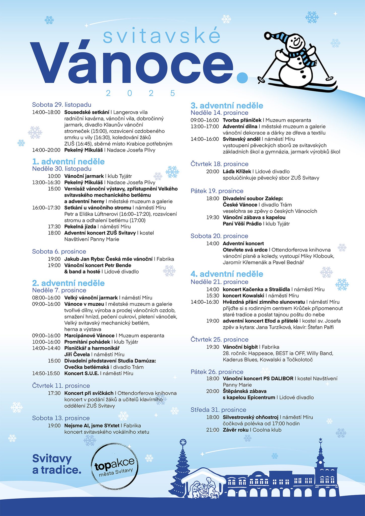 Neděle 7. prosince: Druhá adventní neděle – Vánoce ve Svitavách. V našem muzeu vánoční zvyky a tradice. V muzeu esperanta Marcipánové Vánoce. Na náměstí u školy stánky s Vánocemi. Na pódiu hudebník a písničkář Jirka Čevela a SUE Svitavy Ukulele Ensemble. V Tyjátru nepřetržitě filmové pohádky.