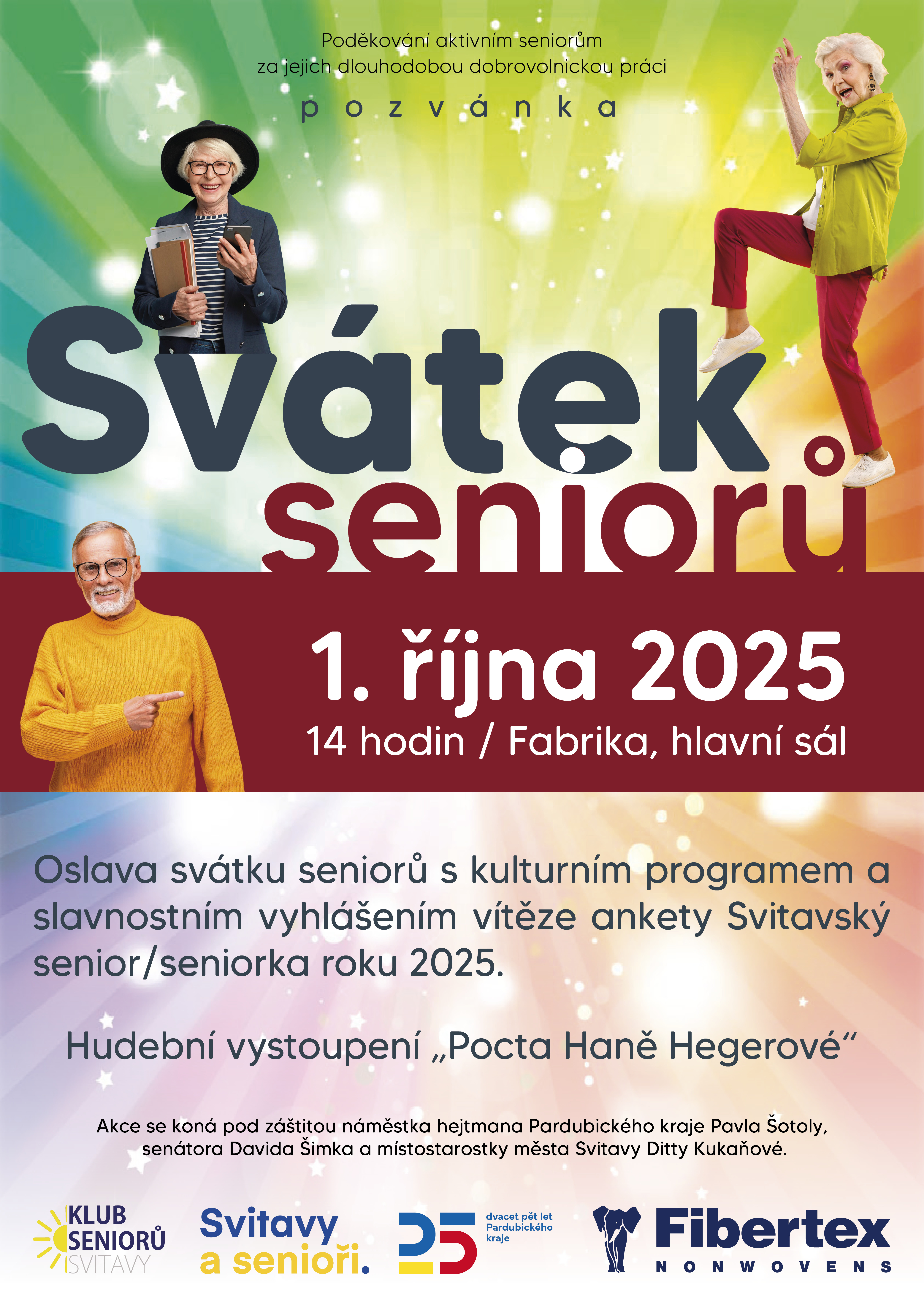 Ve Svitavách oslavíme tento sváteční den přímo ve středu 1. října od 14 hodin v hlavním sále Fabriky. Kromě kulturního programu, kdy na hosty čeká např. hudební vystoupení „Pocta Haně Hegerové“, proběhne slavnostní vyhlášení již čtvrtého ročníku ankety Svitavský senior / seniorka roku. V ní z došlých nominací vybírá Rada seniorů vítěze, kteří svojí výjimečnou činností ovlivňují / ovlivnili nejen své vrstevníky, ale také ostatní občany našeho města. Akce se koná pod záštitou náměstka hejtmana Pardubického kraje Pavla Šotoly, senátora Davida Šimka a místostarostky Ditty Kukaňové a jste na ni, svitavští senioři, srdečně zváni.